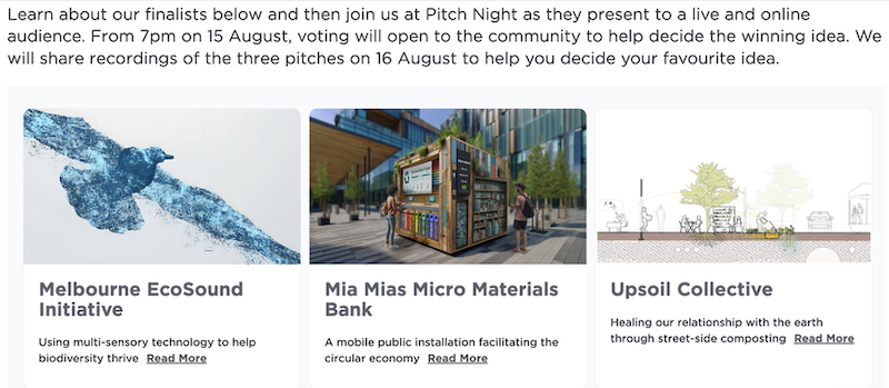 Public voting opens on 15 August and will remain open for two weeks – from 7pm that Thursday night, simply click your preferred project on the City of Melbourne website finalists page. The Council will announce the winner after judging and public voting closes two weeks later.